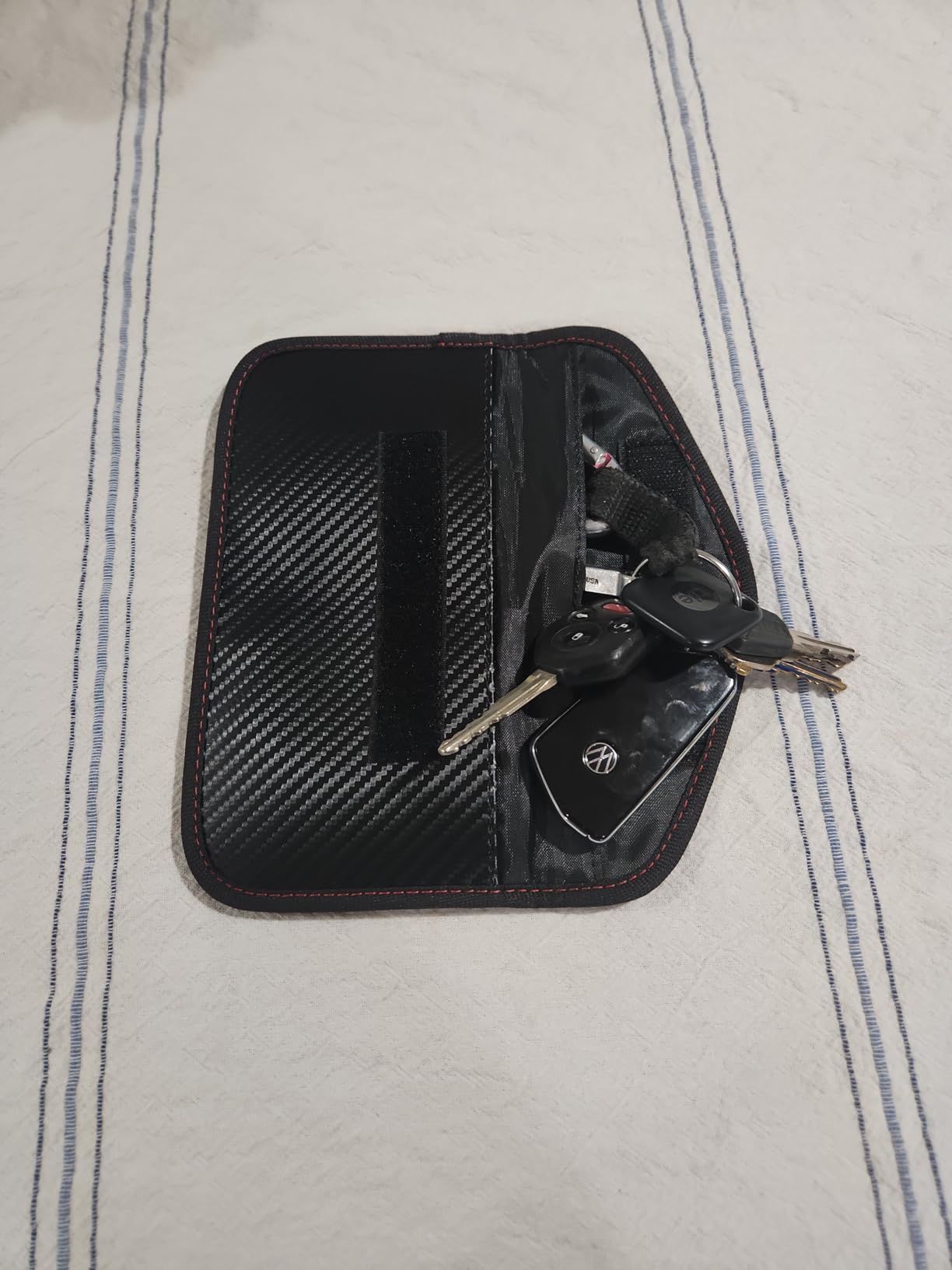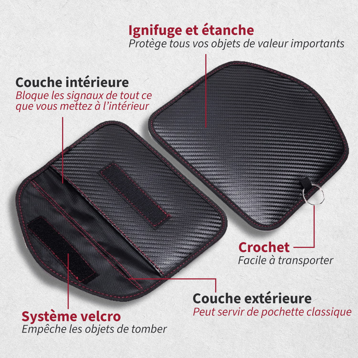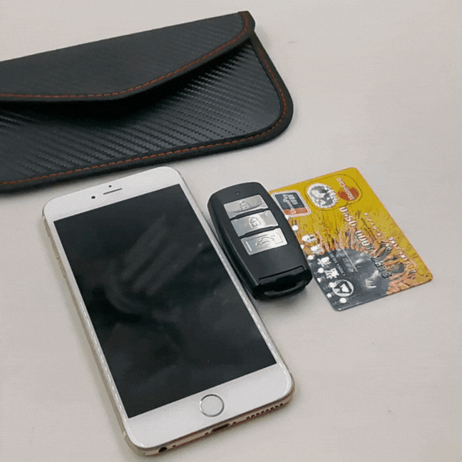 La pochette bloque les signaux radio (RFID, NFC, etc.) émis par votre clé de voiture, rendant impossible leur interception par des voleurs lorsque la clé est à l’intérieur.